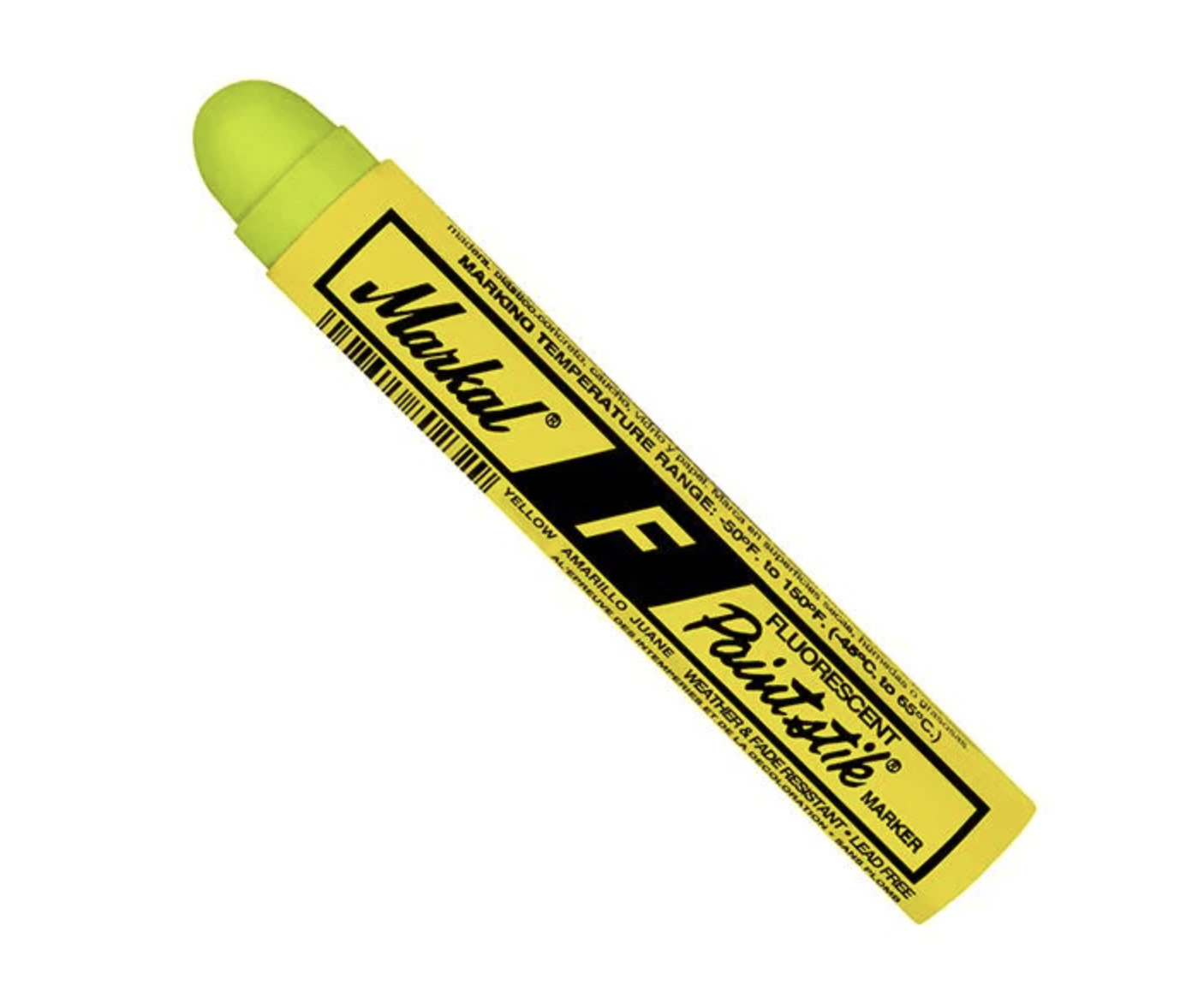 Markal F Fluorescent Yellow Cold Surface Marker with a point size of 11/16″ is suitable for immediate identification in low light conditions and creates highly visible marks. Marker of length 4 3/4″ provides fluorescent marks that illuminate under UV or black light. It has a marking range of -50 to 150 deg F and the easy to hold paperboard holder secures the marker for optimum use. It is ideal for surfaces like steel and iron, pipes and tubes, rubber and tires, glass, plastic, lumber and timber.