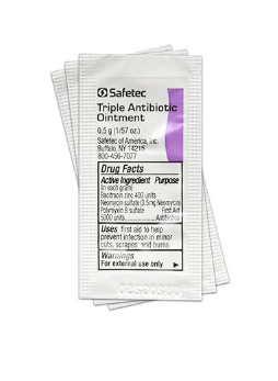 An effective 3-in-1 anti-bacterial ointment used for the prevention and treatment of infection in wounds, abrasions and burns. Helps prevent infection in minor scrapes, burns, and cuts. Individual antibiotic first aid doses prevent contamination of wounds. Contains Bacitracin, Neomycin Sulfate, and Polymyxin B Sulfate to provide antibiotic protection. Sulfa and sulfite free.